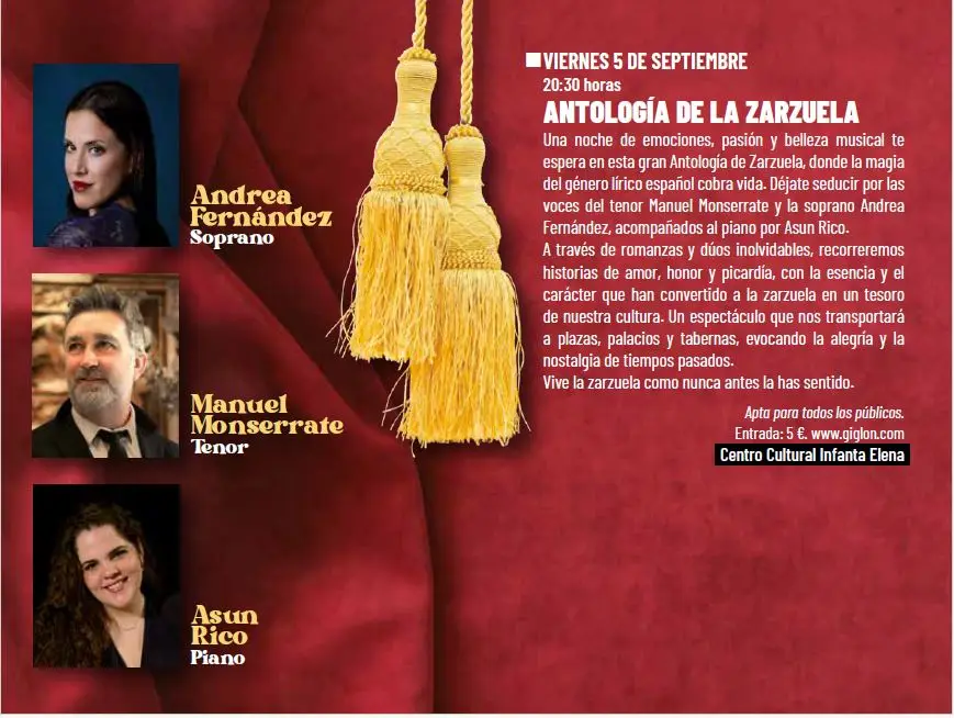 Una noche de emociones, pasión y belleza musical te espera en esta gran Antología de Zarzuela, donde la magia del género lírico español cobra vida. Déjate seducir por las voces del tenor Manuel Monserrate y la soprano Andrea Fernández, acompañados al piano por Asun Rico.