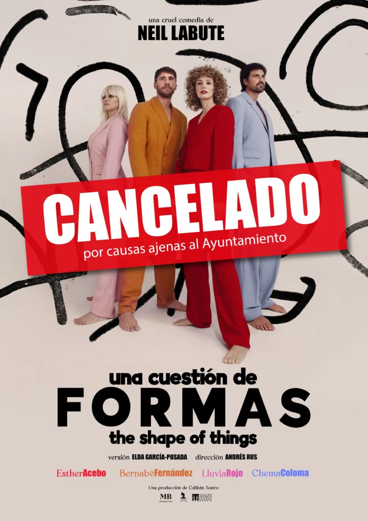 Esther Acebo (”La Casa de Papel”), Lluvia Rojo (”Cuéntame”), Bernabé Fernández y Chema Coloma protagonizan “Una Cuestión de Formas (The Shape of Things)”, de Neil LaBute, uno de los mejores autores norteamericanos del siglo XXI. Estrenada y dirigida por él mismo en 2001 en el Almeida Theatre (el teatro más prestigioso de Londres), se trata de su obra más divertida y fascinante, una comedia negra brillantísima (de sorprendente final) que gira en torno a los límites del arte contemporáneo y donde nada es lo que parece… Con un humor corrosivo y políticamente incorrecto, pocas veces se tiene la ocasión en