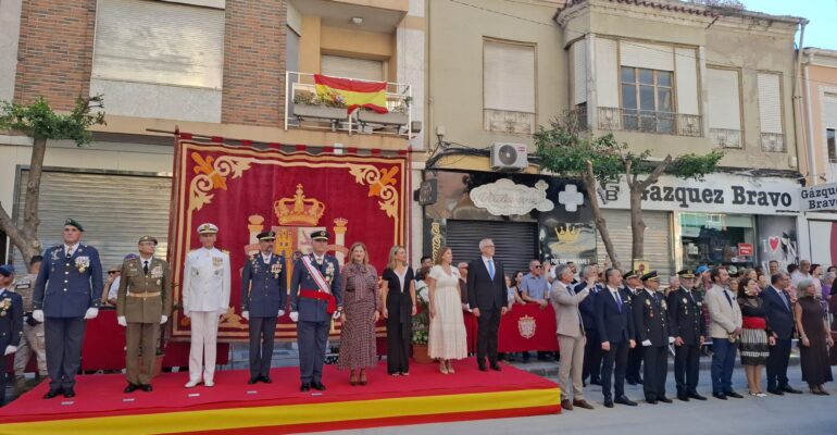 La alcaldesa de Alcantarilla, Paqui Terol, y el general del Ejército del Aire y del Espacio, Fernando Carrillo, junto con el coronel de la Base Aérea, José Ignacio Sánchez-Heredero, han presidido un acto que “muestra el cariño del pueblo de Alcantarilla hacia las Fuerzas Armadas, que se puede comprobar por la cantidad de personas que nos han acompañado esta mañana y por las ventanas y balcones engalanados con la Bandera de España esperando con ilusión el Día de la Fiesta Nacional”, ha señalado la alcaldesa.
