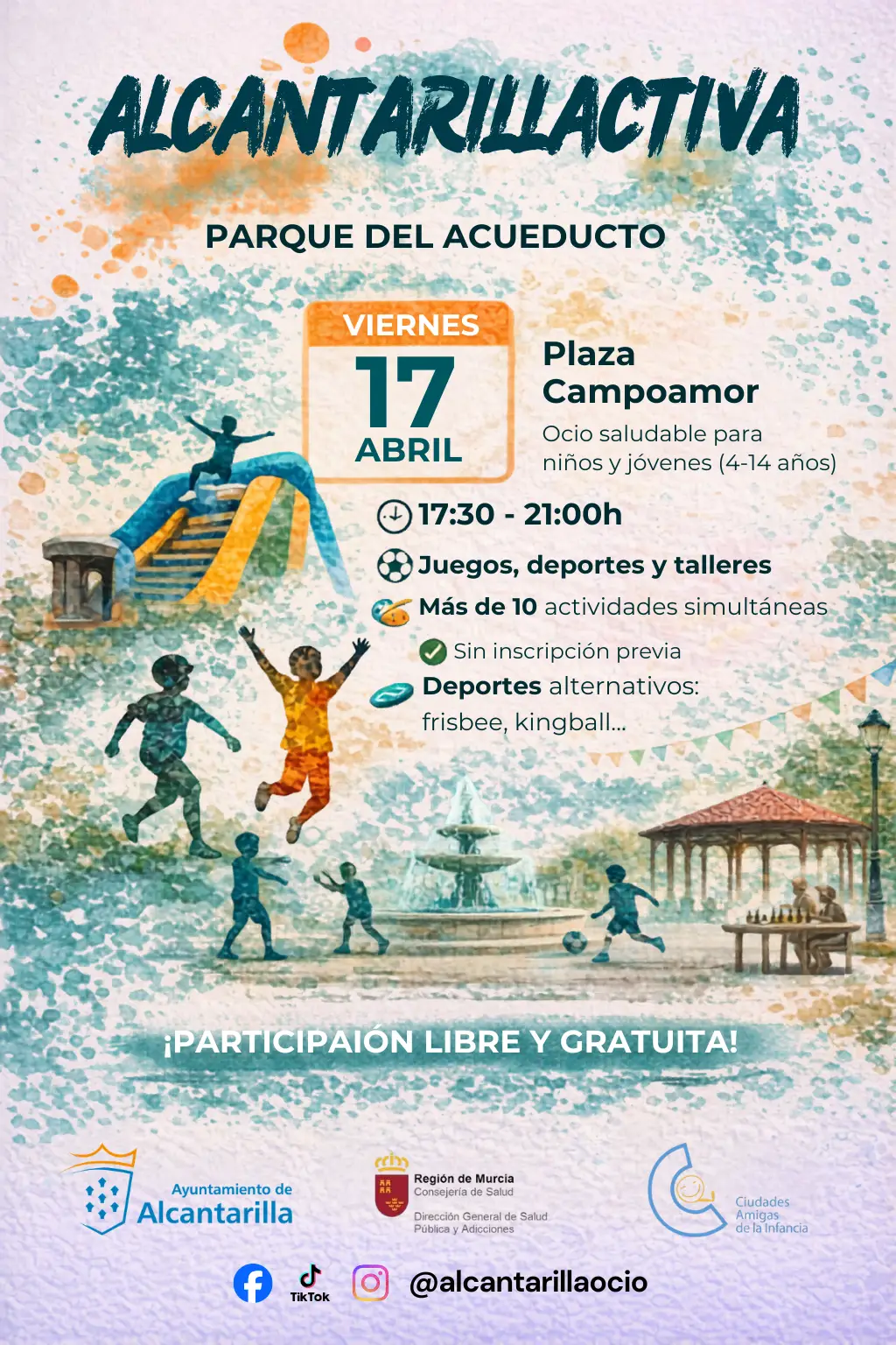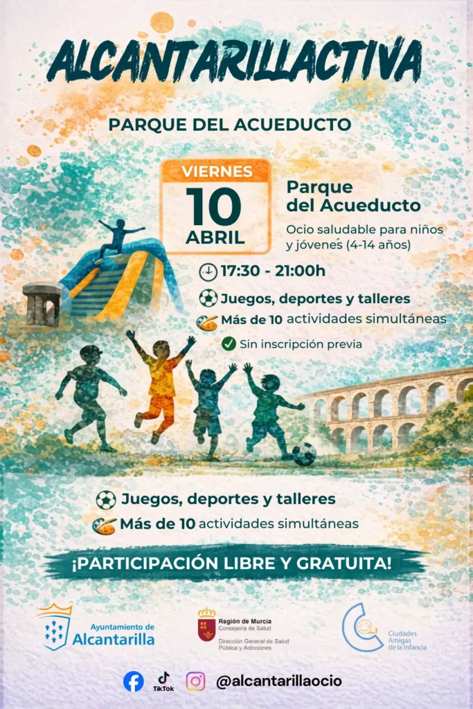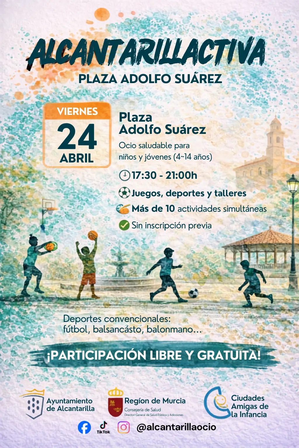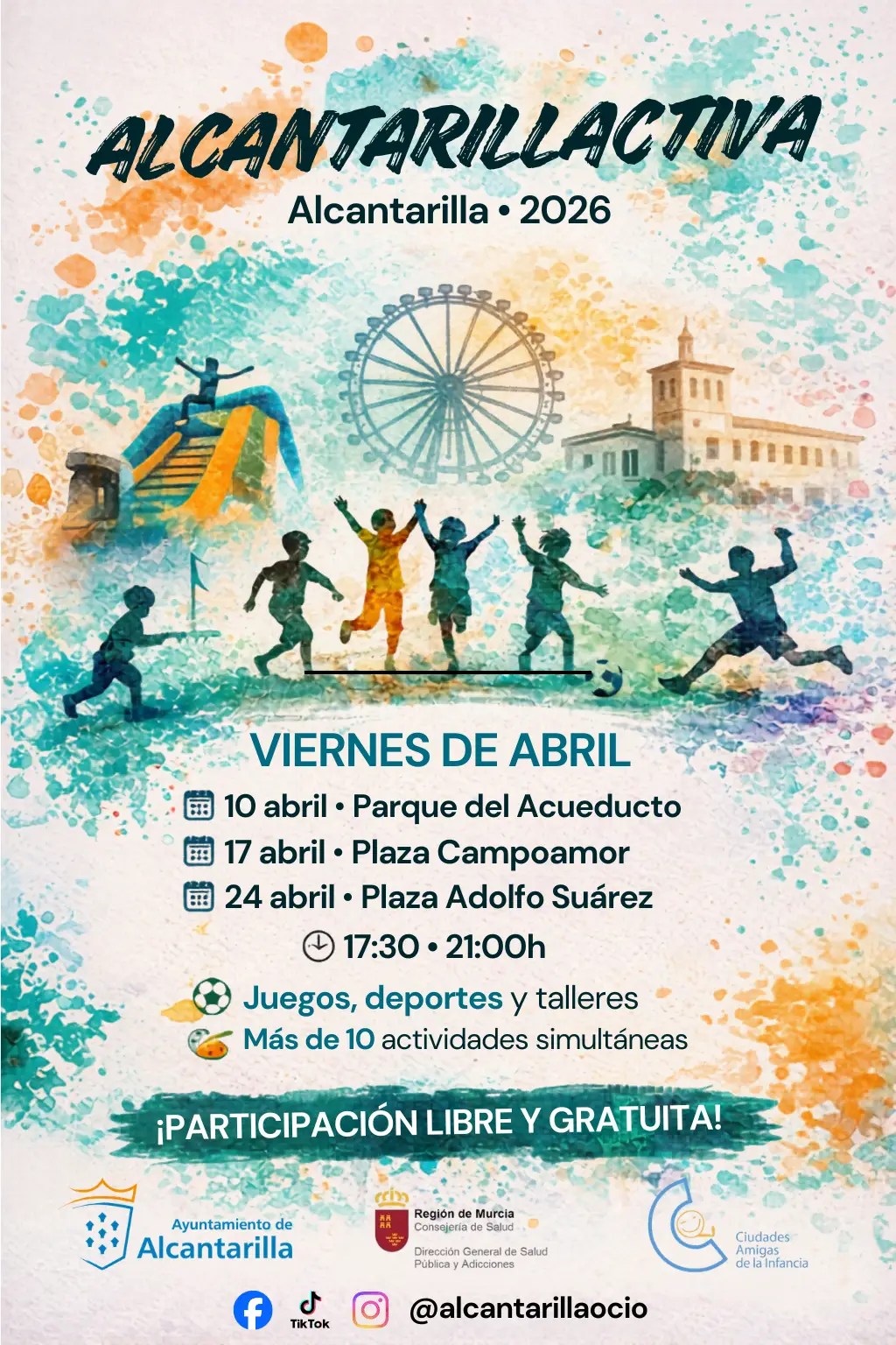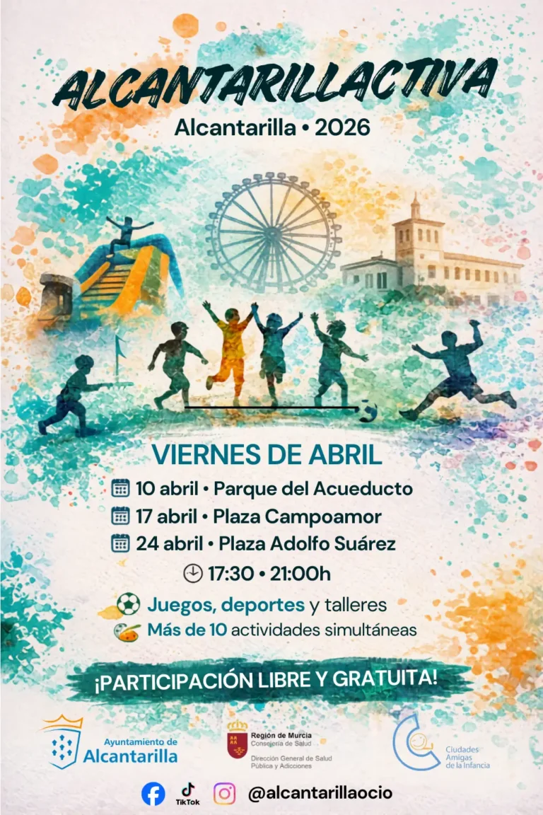 El Ayuntamiento de Alcantarilla, a través de su concejalía de Bienestar Social, Familia y Mujer y con la financiación de la Consejería de Salud, a través de la Dirección General de Salud Pública y Adicciones de la Región de Murcia, llenará distintas plazas del municipio con actividades, los viernes, del 10 al 24 de abril de 2026, de 17:30 a 21 h, llevando a cabo el programa AlcantarillActiva, consistente en actividades y talleres de ocio saludable para menores y jóvenes. Ven a divertirte con hinchables, juegos, talleres, deporte, animación y mucho más.