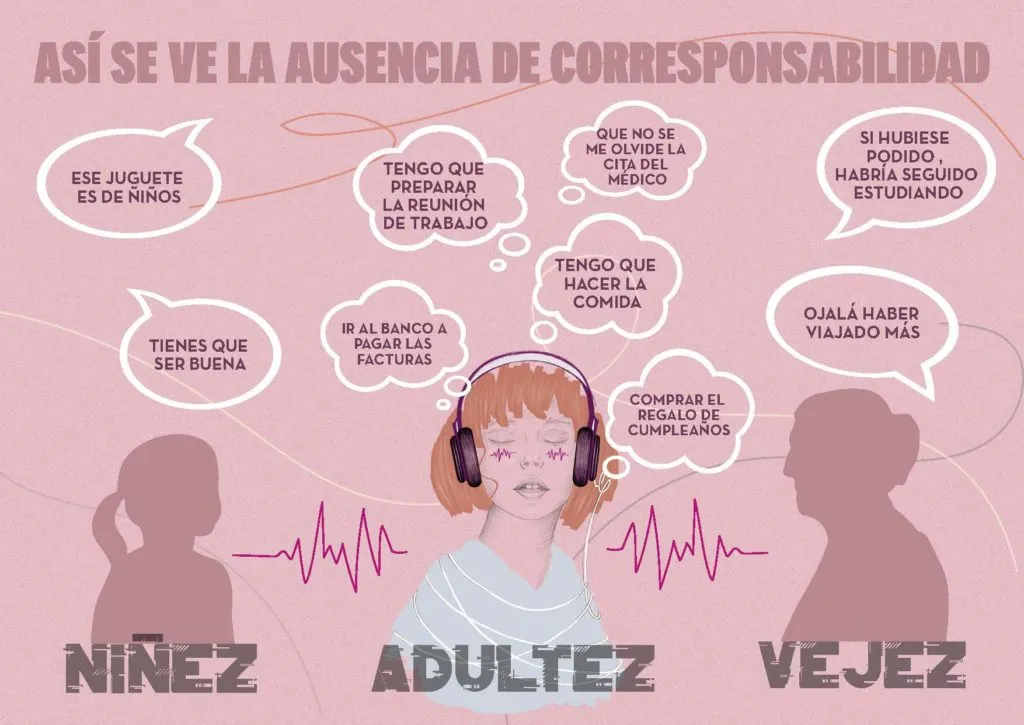 Así, en el caso de la ausencia de CORRESPONSABILIDAD, es, tradicionalmente la mujer, la que asume mayor carga de tareas en casa y en la vida familiar en general. De tal manera, que estos “cascos” no se comparten, y la canción solamente la escucha una persona, la mujer, impidiendo tener momentos de relajación, de desconexión.