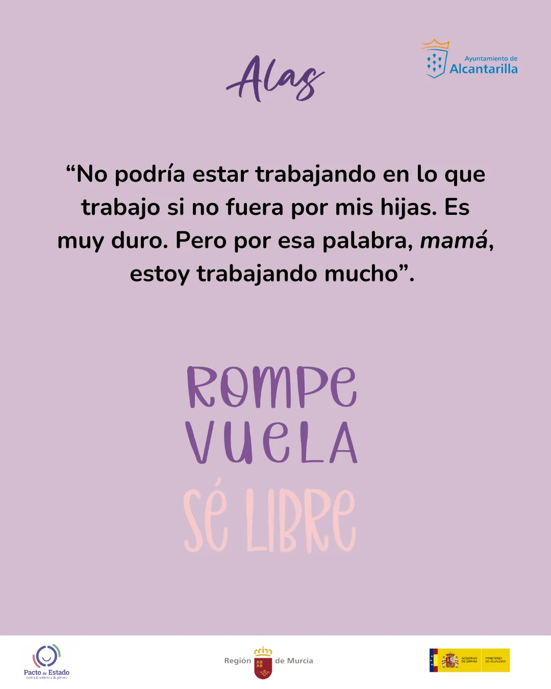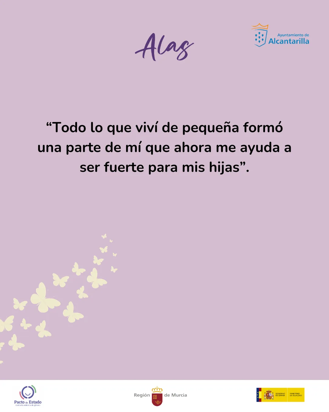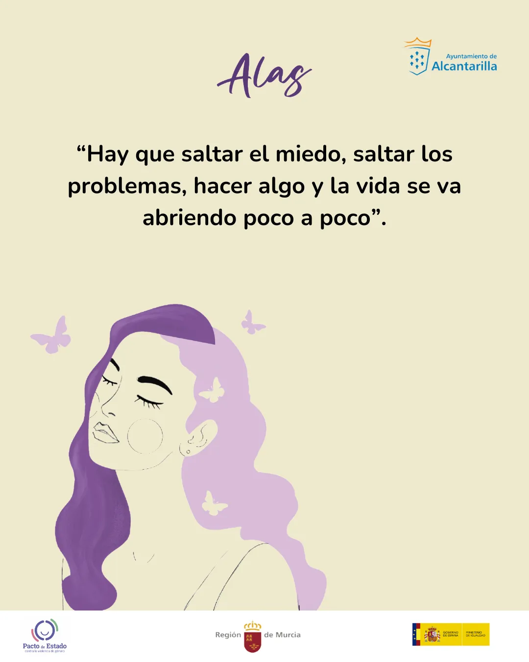 En el contexto de la Campaña ALAS, por el Día de la Lucha Contra la Violencia de Género, quisimos dar voz a las mujeres de Alcantarilla, que se dieran entre todas metafóricamente la mano. El objetivo era crear una cadena de mensajes entre mujeres para que entre todas pudiéramos intercambiar todos esos aprendizajes que nos han ido acompañando durante el camino, que hemos ido desarrollando conforme la vida nos ha ido poniendo obstáculos.