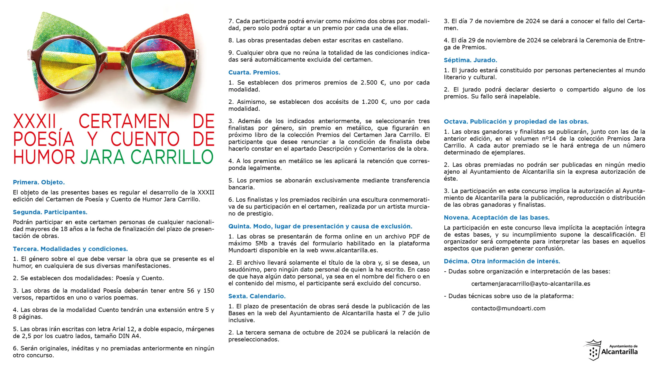 El Certamen Jara Carrillo de Poesía y Cuento de Humor alcanza en esta convocatoria su XXXII edición. Así, los primeros premios de ambos géneros, poesía y cuento recibirán 2.500 € cada uno y, a su vez, los accésits percibirán 1.200 € en sus respectivas modalidades.