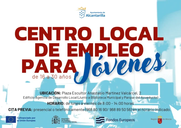 En el Centro Local de Empleo para Jóvenes del Ayuntamiento de Alcantarilla te ayudamos a conseguir tu objetivo laboral, con elaboración de itinerarios de inserción laboral y/o formativa. Estos itinerarios incluyen información sobre el mercado de trabajo, intermediarios laborales, oposiciones y procesos selectivos públicos; herramientas para la búsqueda de empleo, oferta formativa a nivel académico y del empleo, etc.