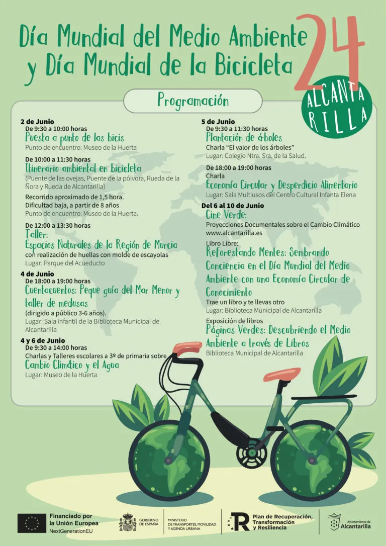 Durante el día 2 de junio y la semana del 3 al 9 de junio del 2024 la Concejalía de Desarrollo Económico y Proyectos Europeos, van a llevar a cabo una serie de actividades para celebrar el Día Mundial de la Bicicleta, que es el 3 de junio, y el Día Mundial del Medio Ambiente, que es el 5 de junio.