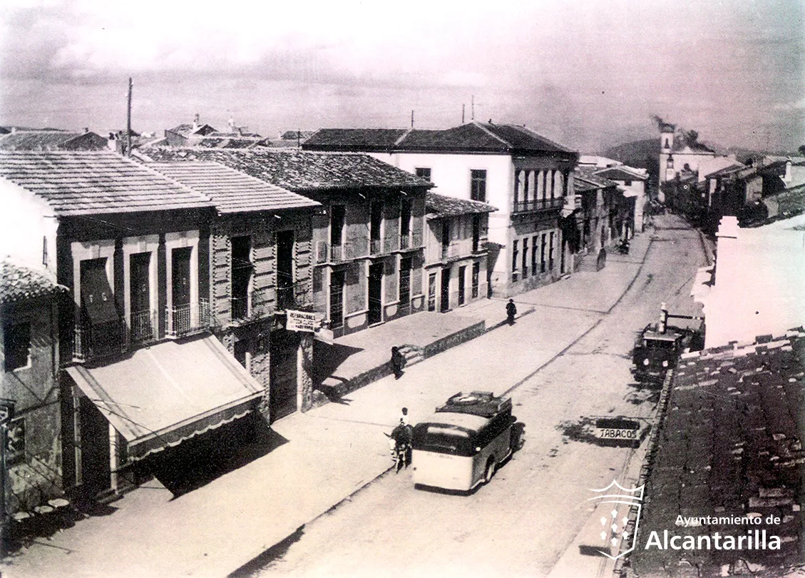 In the early 1940s, Alcantarilla’s main thoroughfare was lined with two-storey houses and wide pavements on both sides of the cobbled road, along which the means of transport of the time, known as “coche de línea” (liner car), used for journeys to Murcia, travelled. On the right, next to the parked lorry, was José Alemán’s petrol pump, installed on the pavement of Calle Mayor since 1924, next to Calle Cartagena.