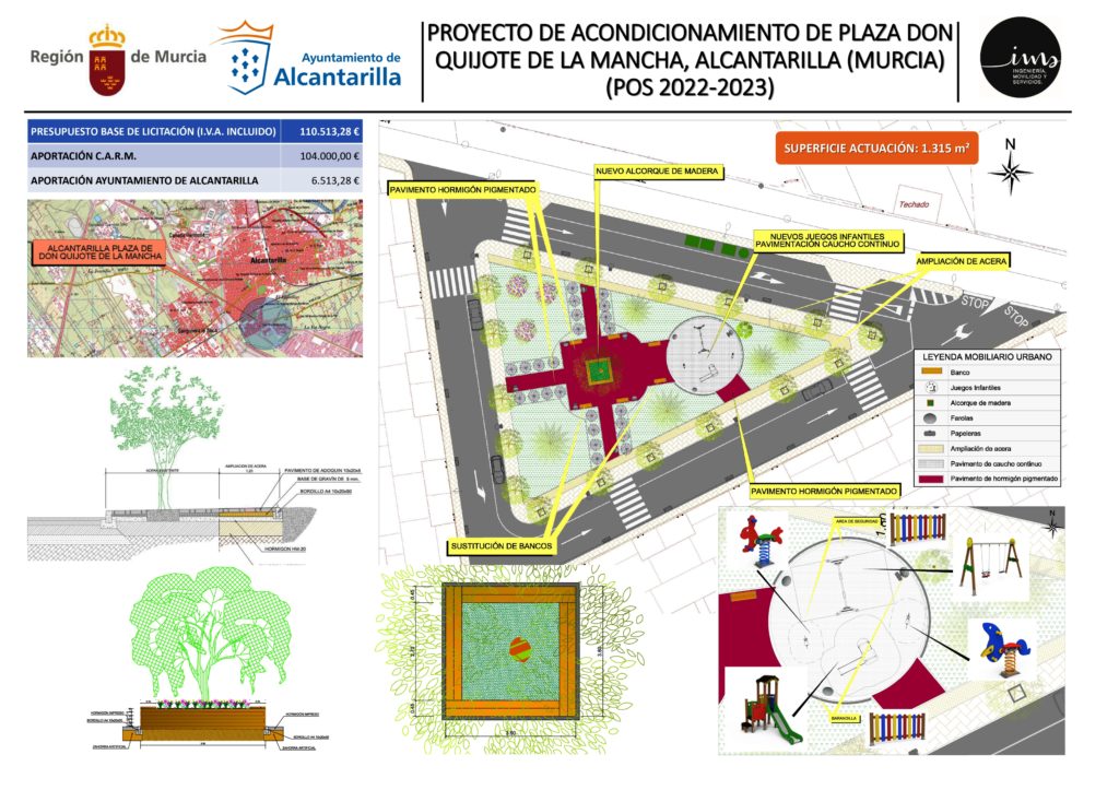 Otra de las actuaciones que dependen del Plan de Obras y Servicios es la renovación de la Plaza Don Quijote de la Mancha, en el barrio de Las Tejeras, que tiene una superficie de 1.315 metros cuadrados y se encuentra en el acceso a Alcantarilla desde el Polígono Industrial Oeste.