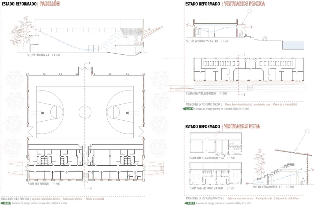 Las obras también dotarán al pabellón Fausto Vicent de aislamiento térmico con la renovación de la envolvente, la sustitución de la carpintería y una nueva cubierta de panel sándwich. La climatización se realizará a través una caldera de biomasa y una instalación solar térmica centralizada, además de un sistema de aerotermia, ventanas mecanizadas y zonas de paso bioclimáticas con madera y vegetación, que generan sombra y regulan la temperatura.