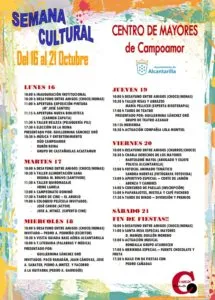 El Centro de Personas Mayores del Barrio de Campoamor, en Alcantarilla, celebra su semana cultural desde hoy hasta el 21 de octubre, con exposiciones, música, talleres, teatro, cine, tertulias literarias, dominó, visita guiada a la Base Aérea de Alcantarilla, concurso de paellas y degustación de gastronomía de la huerta.
