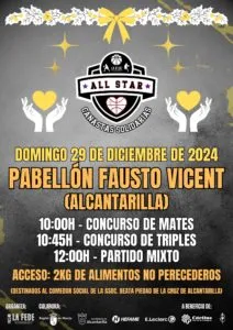 El Pabellón Fausto Vicent de Alcantarilla acoge el próximo domingo, 29 de diciembre el All-Star benéfico Canastas Solidarias, organizado por la Federación de Baloncesto de la Región de Murcia y el Ayuntamiento.