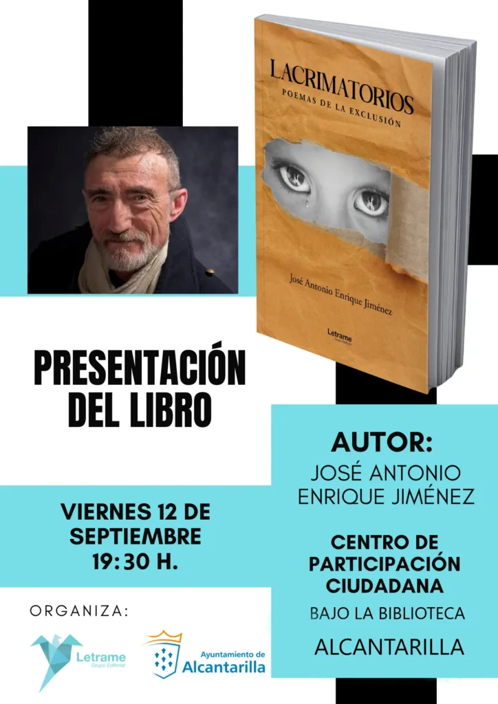 Jose Antonio Enrique Jiménez presenta su nuevo poemario “Lacrimatorios. Poemas de la exclusión”, continuando con su labor como trabajador y poeta social, considerando en esta nueva obra cada poema como una lágrima recogida en lacrimatorios que representan las diversas escenas de sufrimiento del drama de la exclusión, haciendo un acto de reflexión que sirve como catarsis para el autor y los lectores.