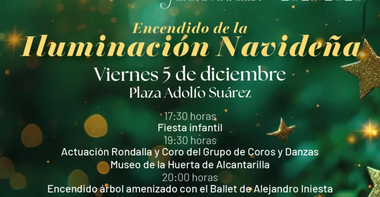 Mañana viernes, 5 de diciembre, comienza la Navidad en Alcantarilla, con el encendido del árbol de 17 metros de altura que está instalado en la plaza Adolfo Suárez y de la iluminación de las calles y plazas de la ciudad, a las 20:00 horas.